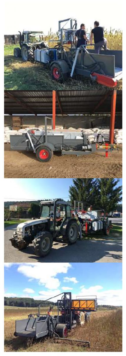 In summary, is an easy to service, robust hemp harvester that works with any standard tractor**. This harvester is specifically designed to harvest simultaneously hemp flowers and hemp stalks. the machine has active levelling flower cutter with conveyor system filling the self-unloading conveyor bunker and a ground-level cutter for hemp stalks.